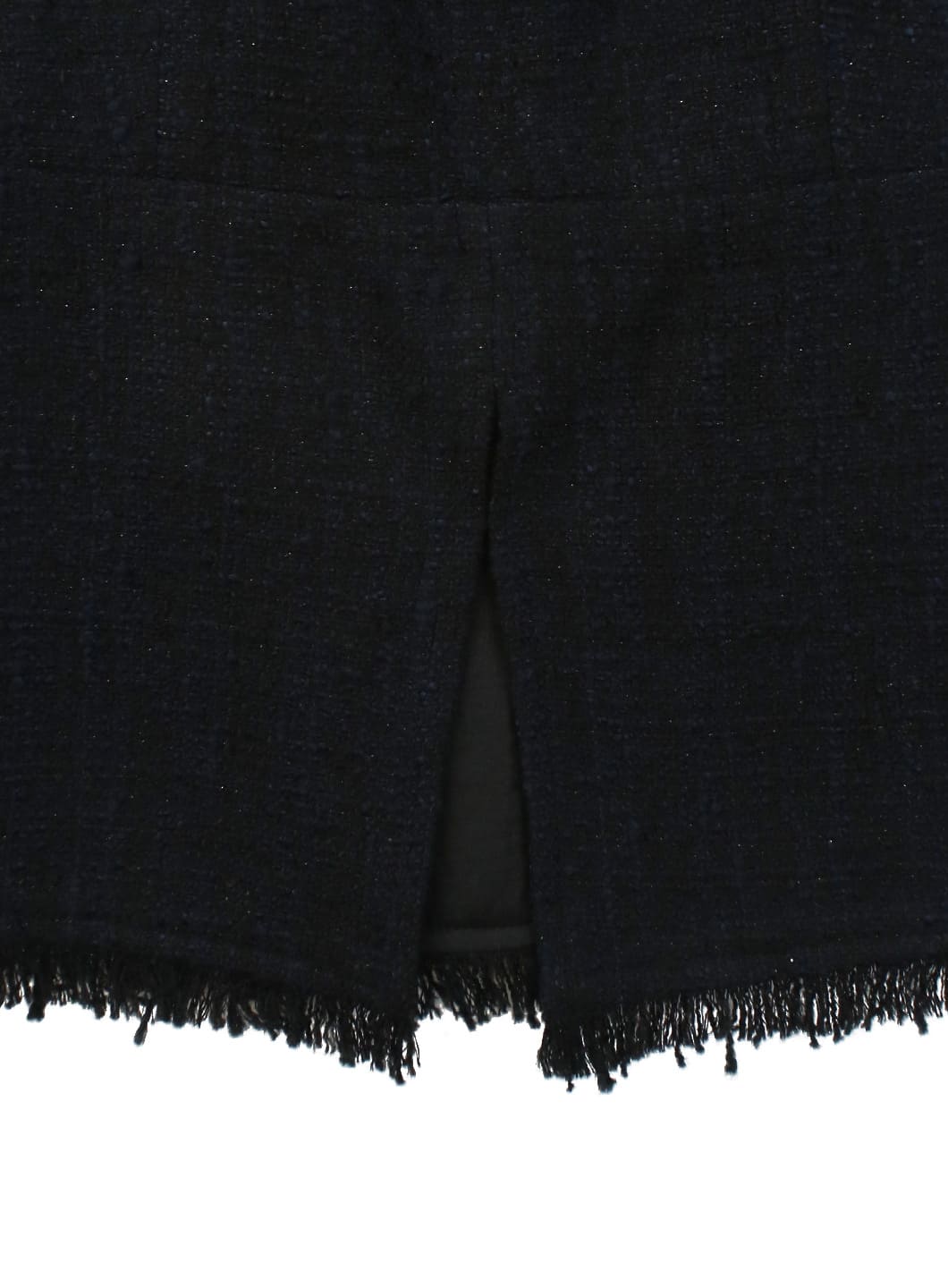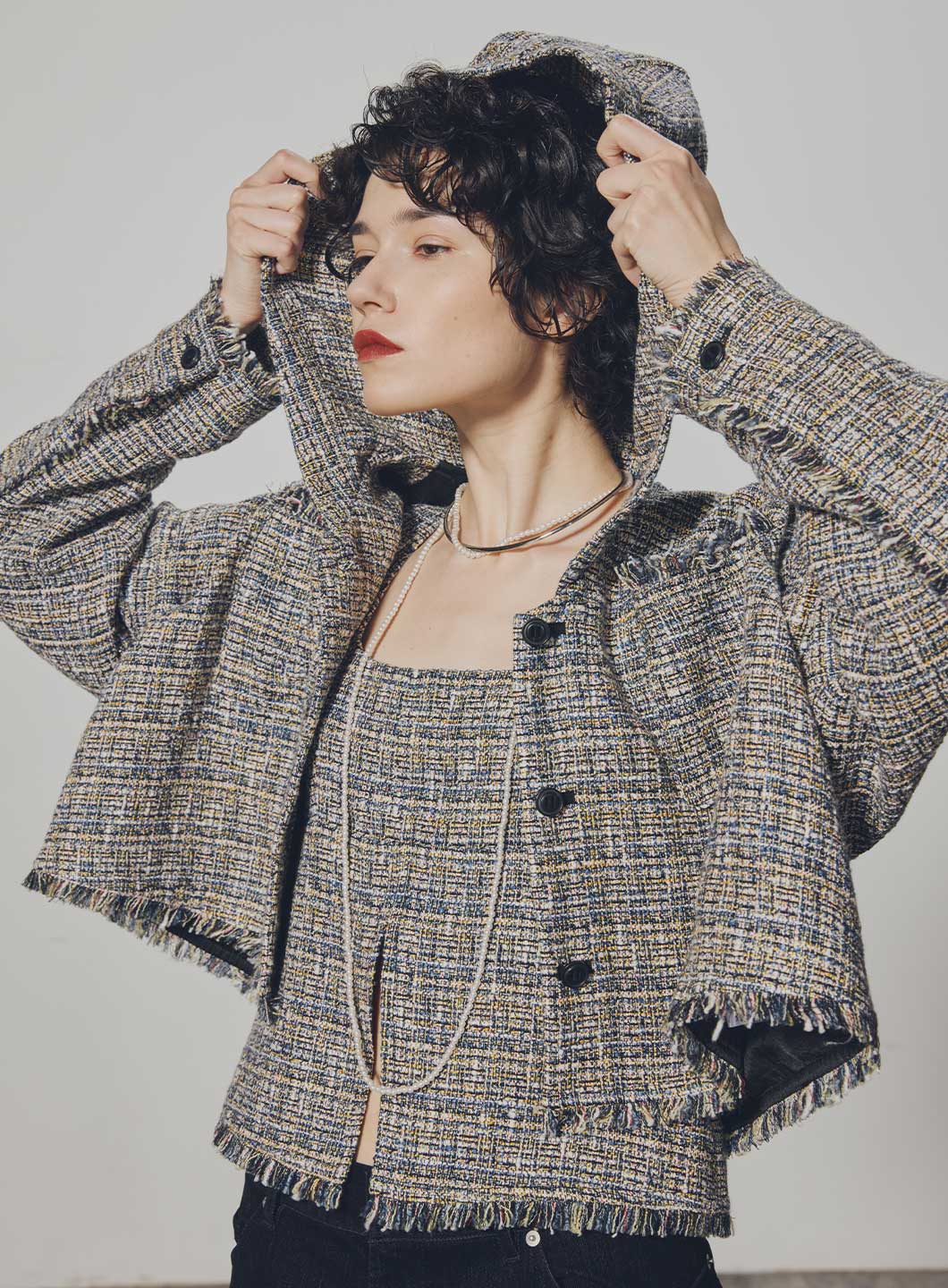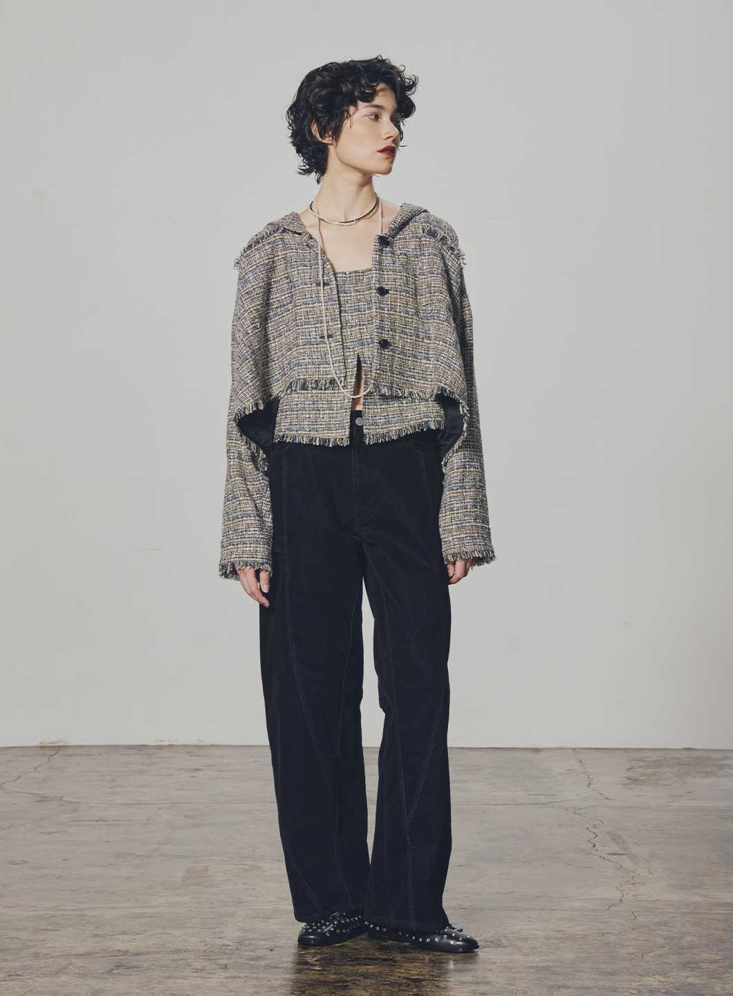 同素材で製作した<185406028 ツイードベルト付きスカート>とのセットアップがオススメ。