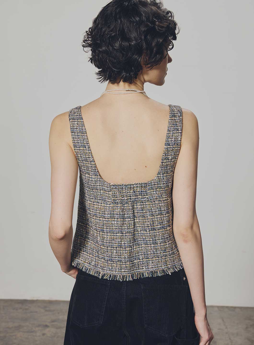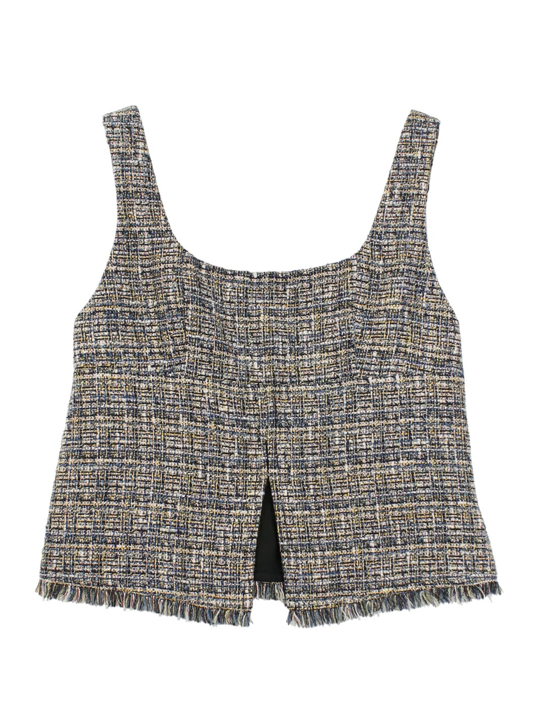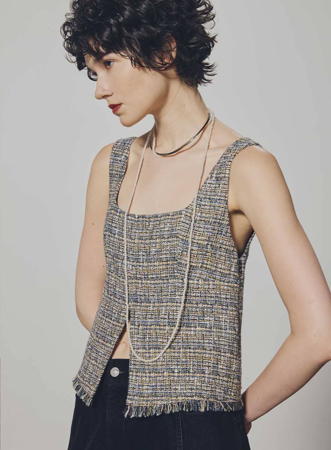 同素材で製作した<185406028 ツイードベルト付きスカート>とのセットアップがオススメ。