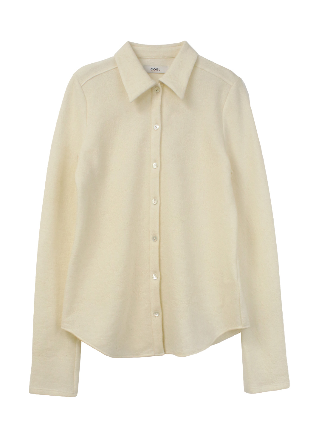 デザインはシンプルなシャツカラーで、ダーツデザインでウエストをシェイプし、女性らしいシルエットを作っています。