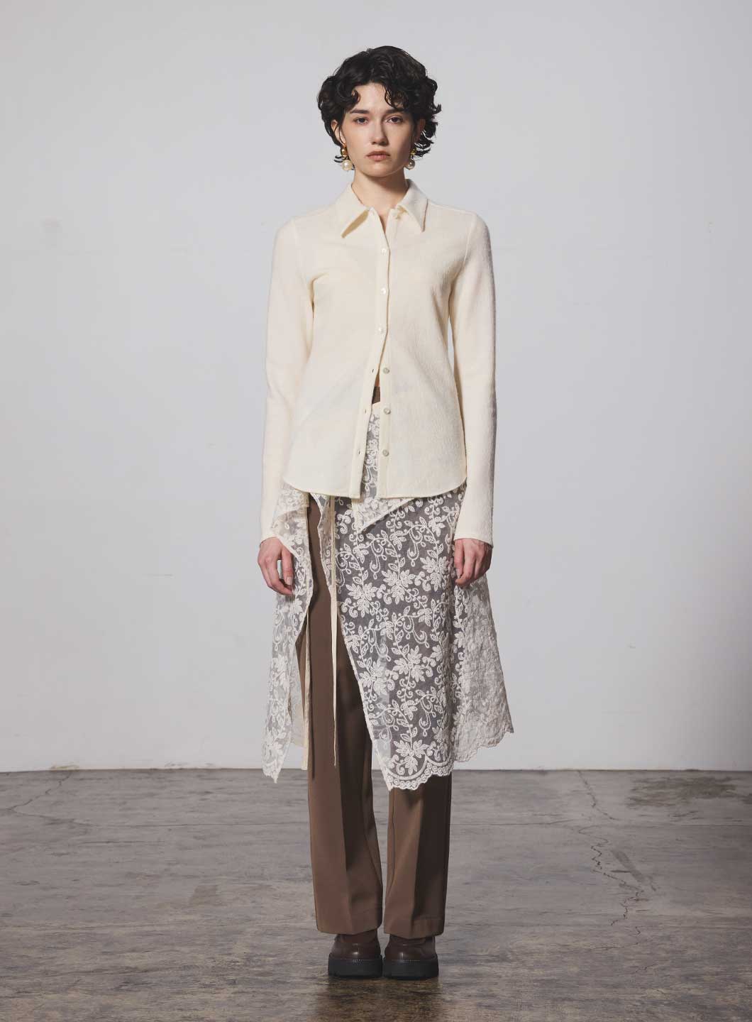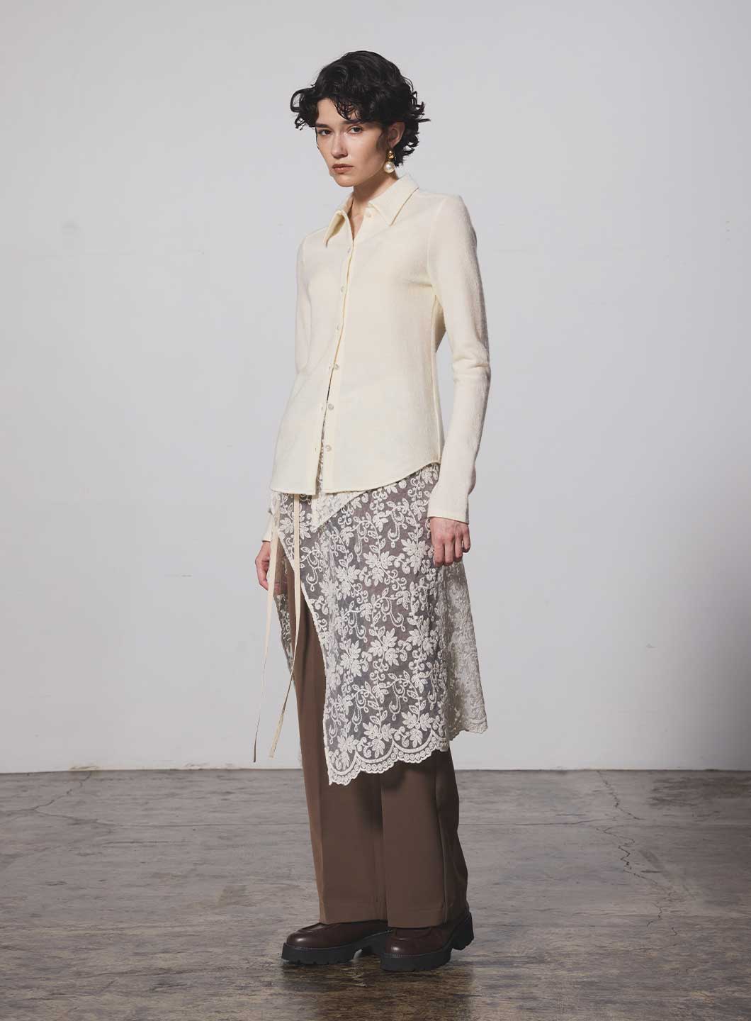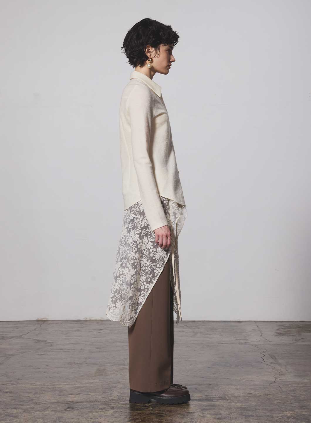 シンプルにパンツ合わせで、フロントボタンの開閉を活かしてバランスよく着用するのがオススメ。