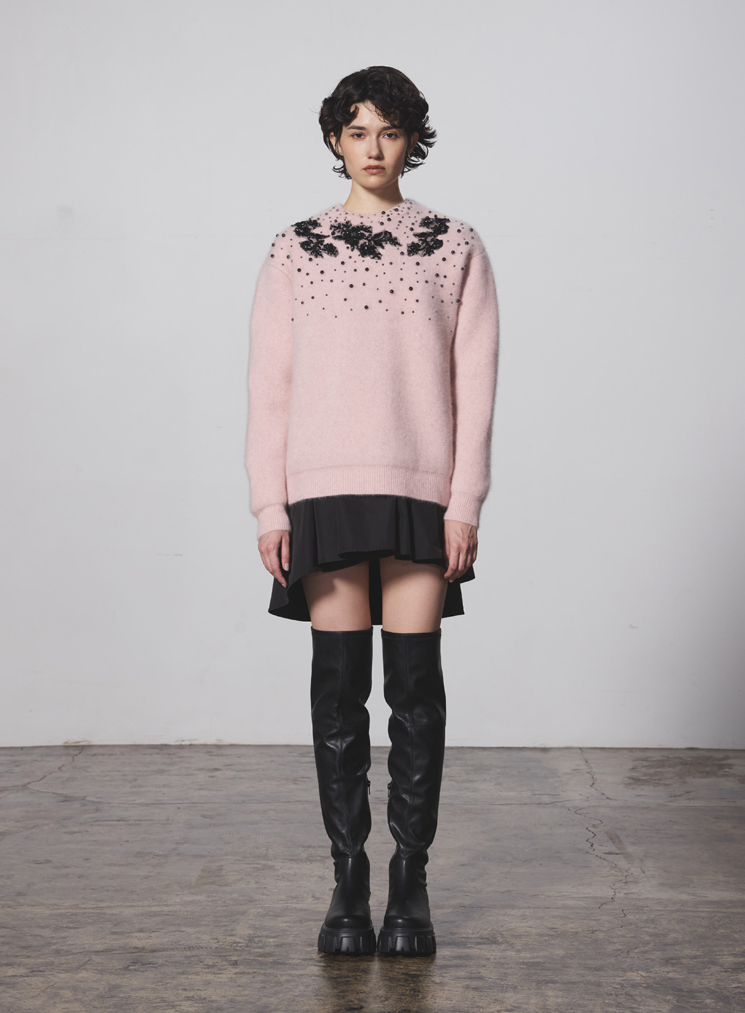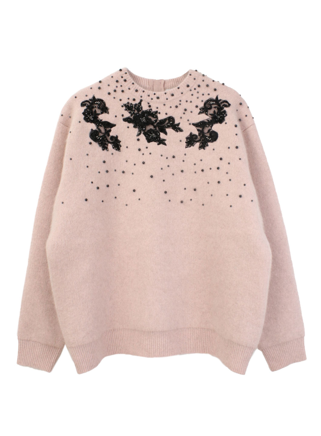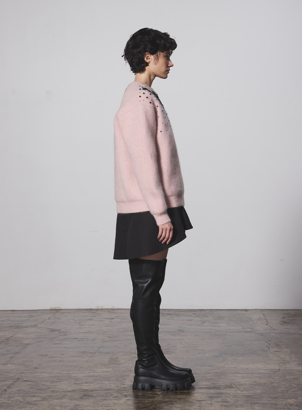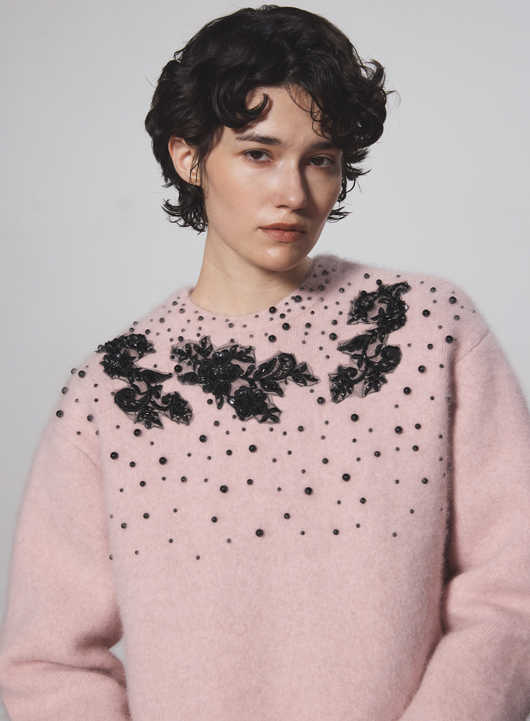 パーティーシーズンにぴったりのニットです。裏側には異なる糸を組み合わせたジャガード編みを採用し、見えない部分にもこだわりました。
