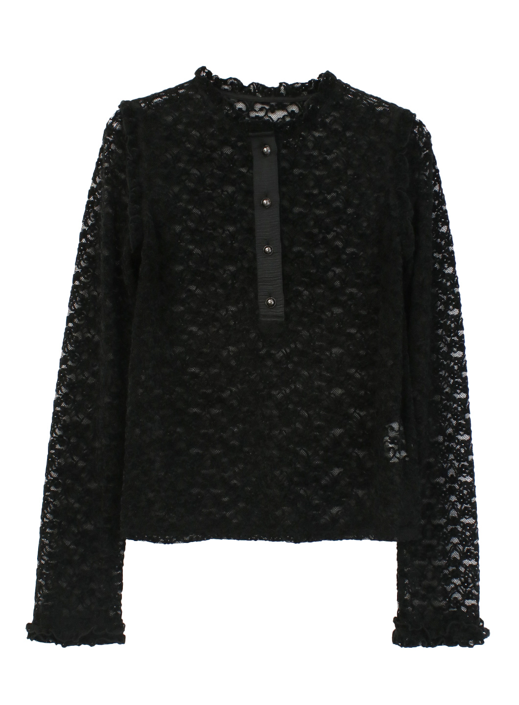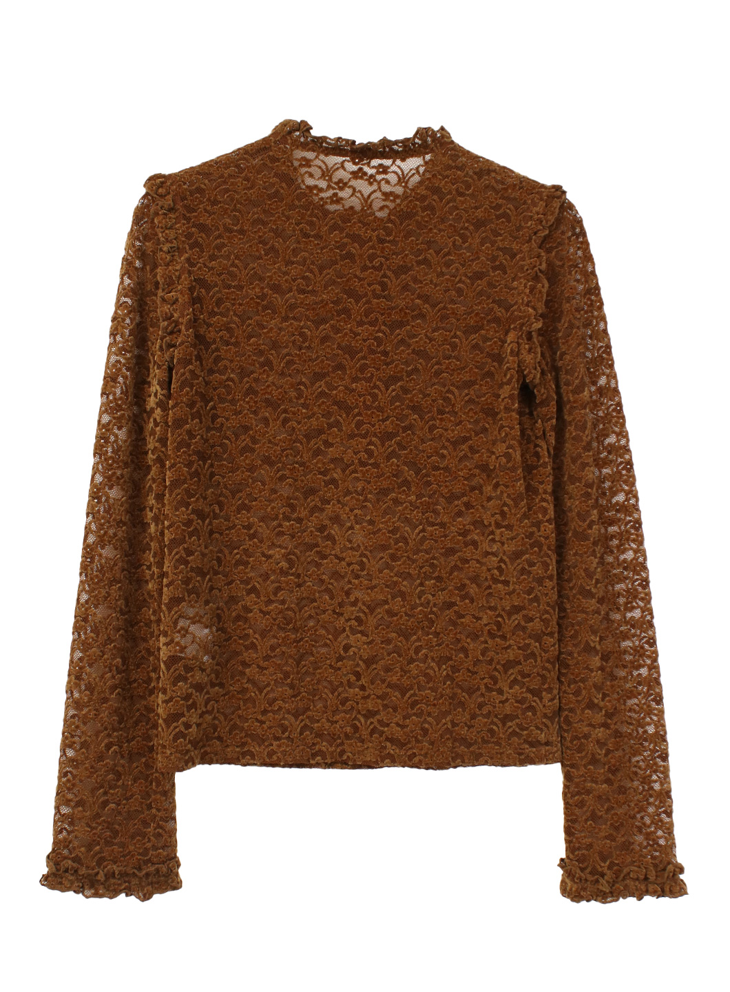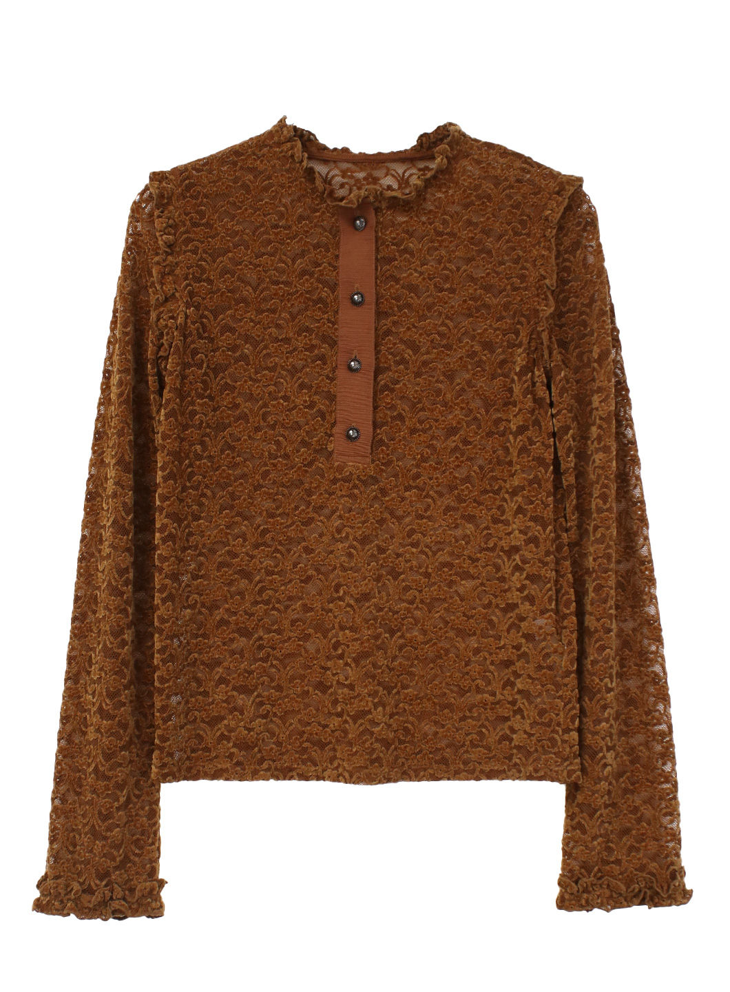 1枚できてもサマになるよう、フロントにあきを作ったり、肩や袖口にミニフリルを施したりとディテールにこだわったトップスです。