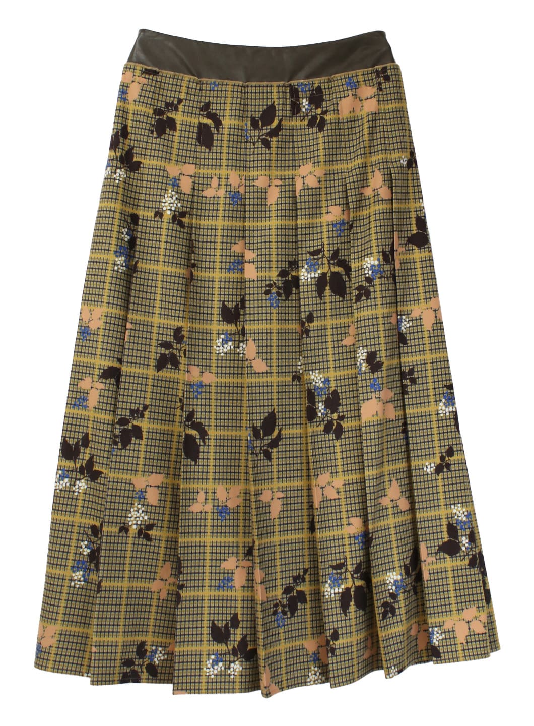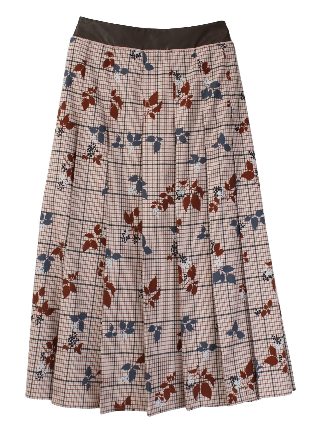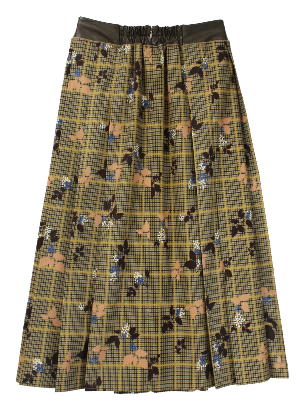 ビンテージ加工の入ったエコレザーの素材をベルトで切り替えた、キャッチーなプリーツスカート。