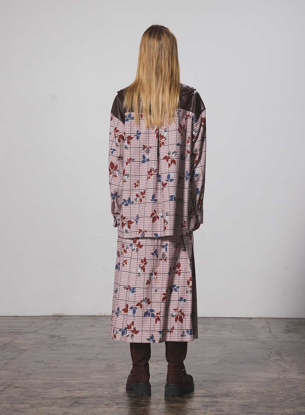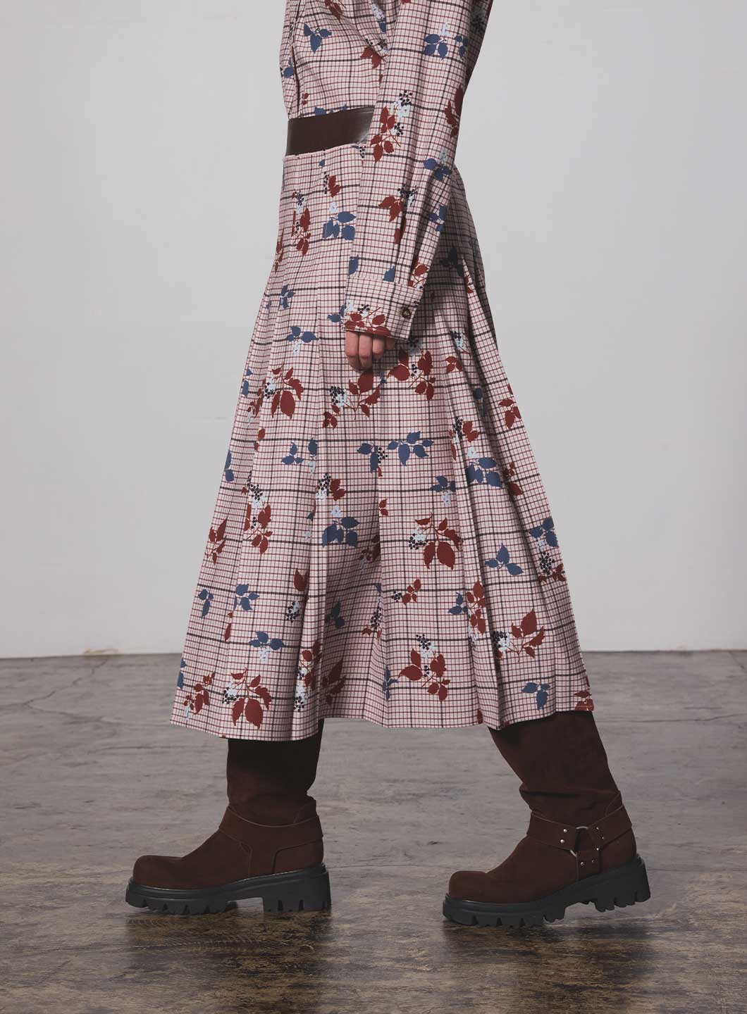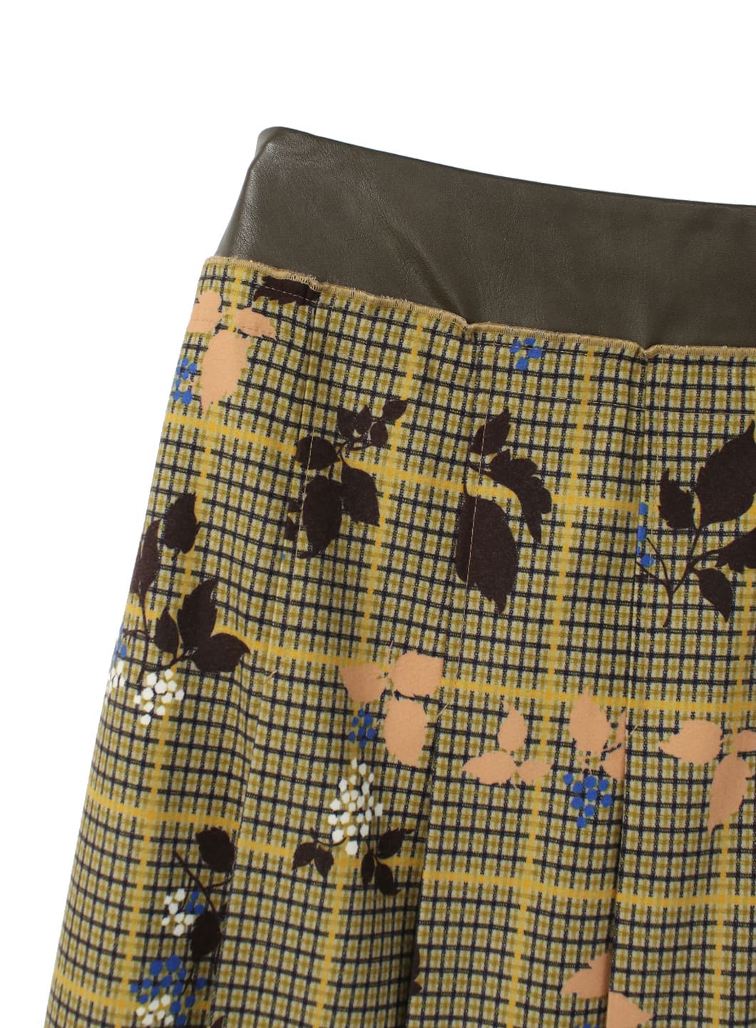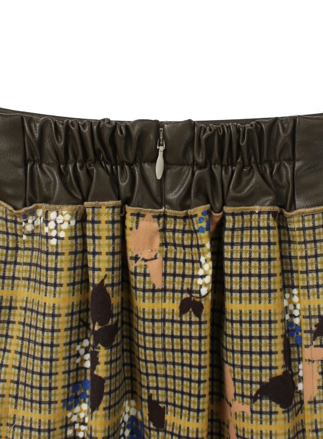 ビンテージ加工の入ったエコレザーの素材をベルトで切り替えた、キャッチーなプリーツスカート。