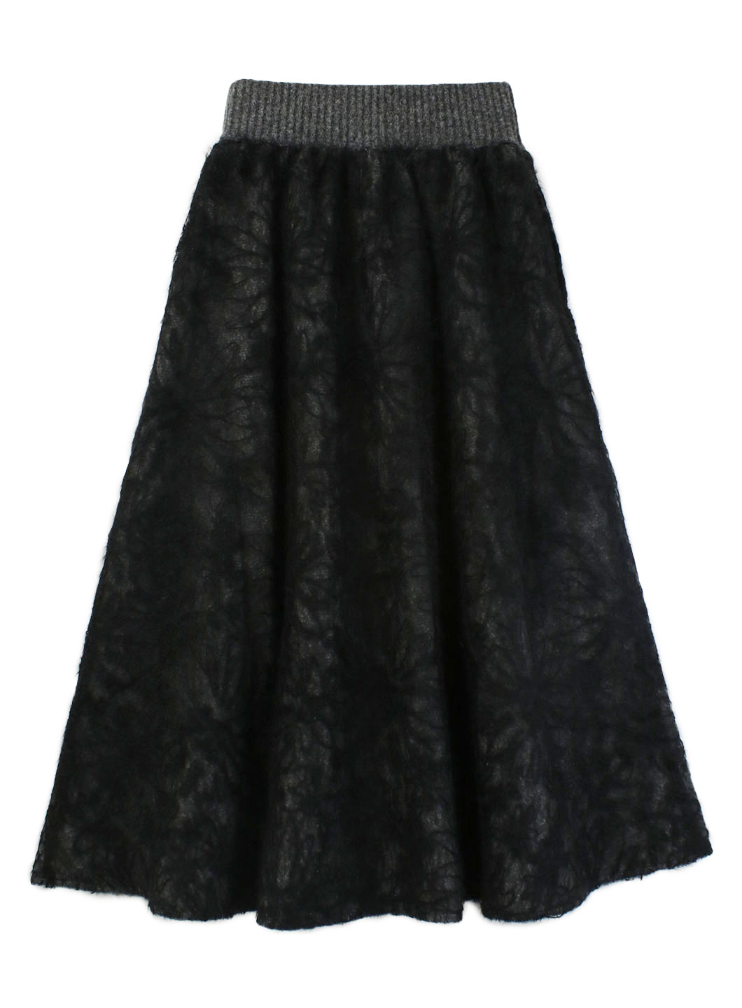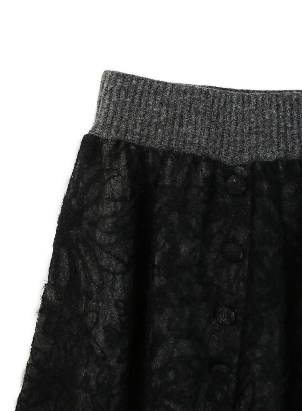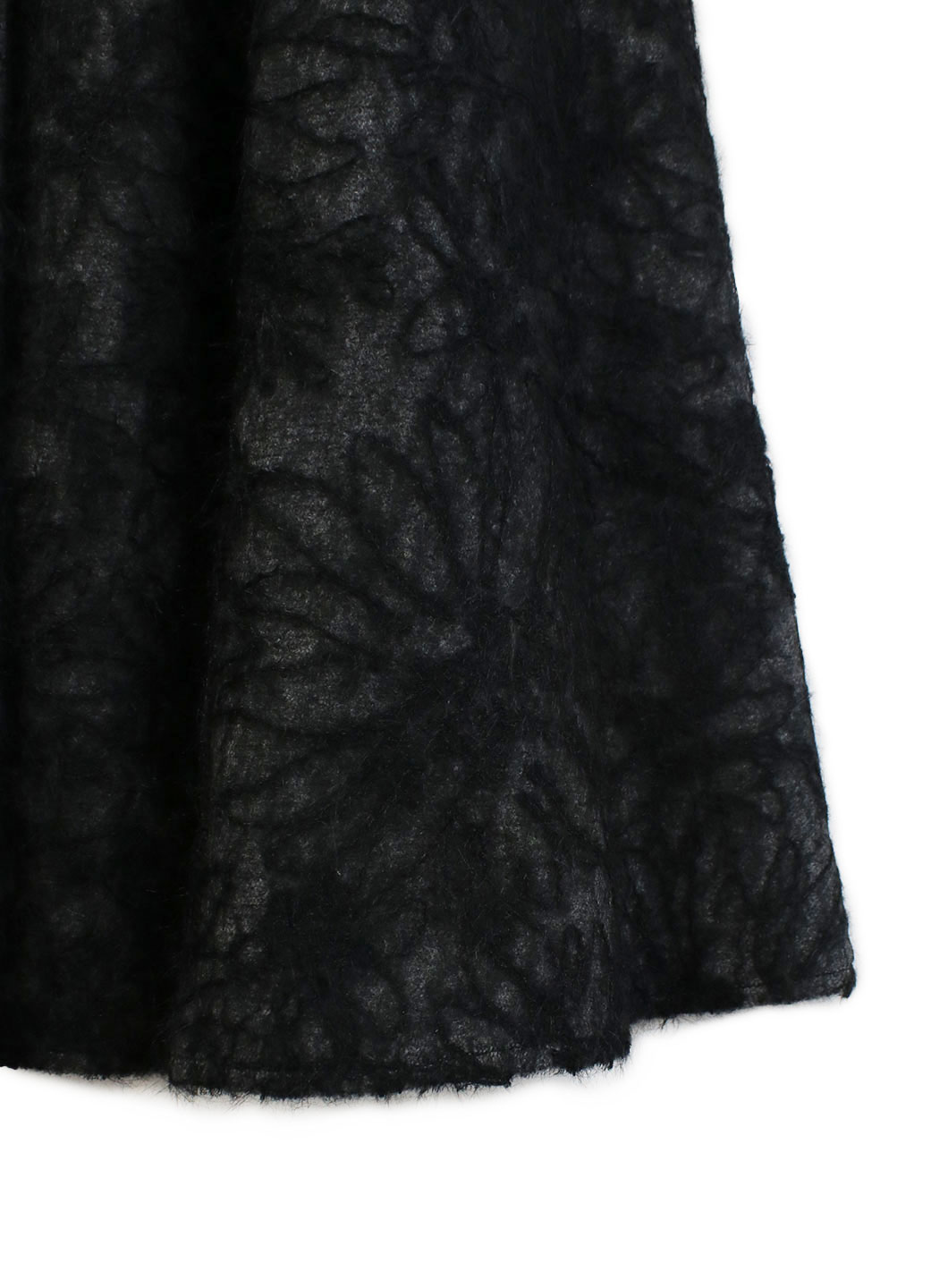 起毛のようなシャギーの糸が絡んでいるレースと、総針の編み地の糸を剥いだ生地にして作成したボリュームたっぷりのレーススカート。