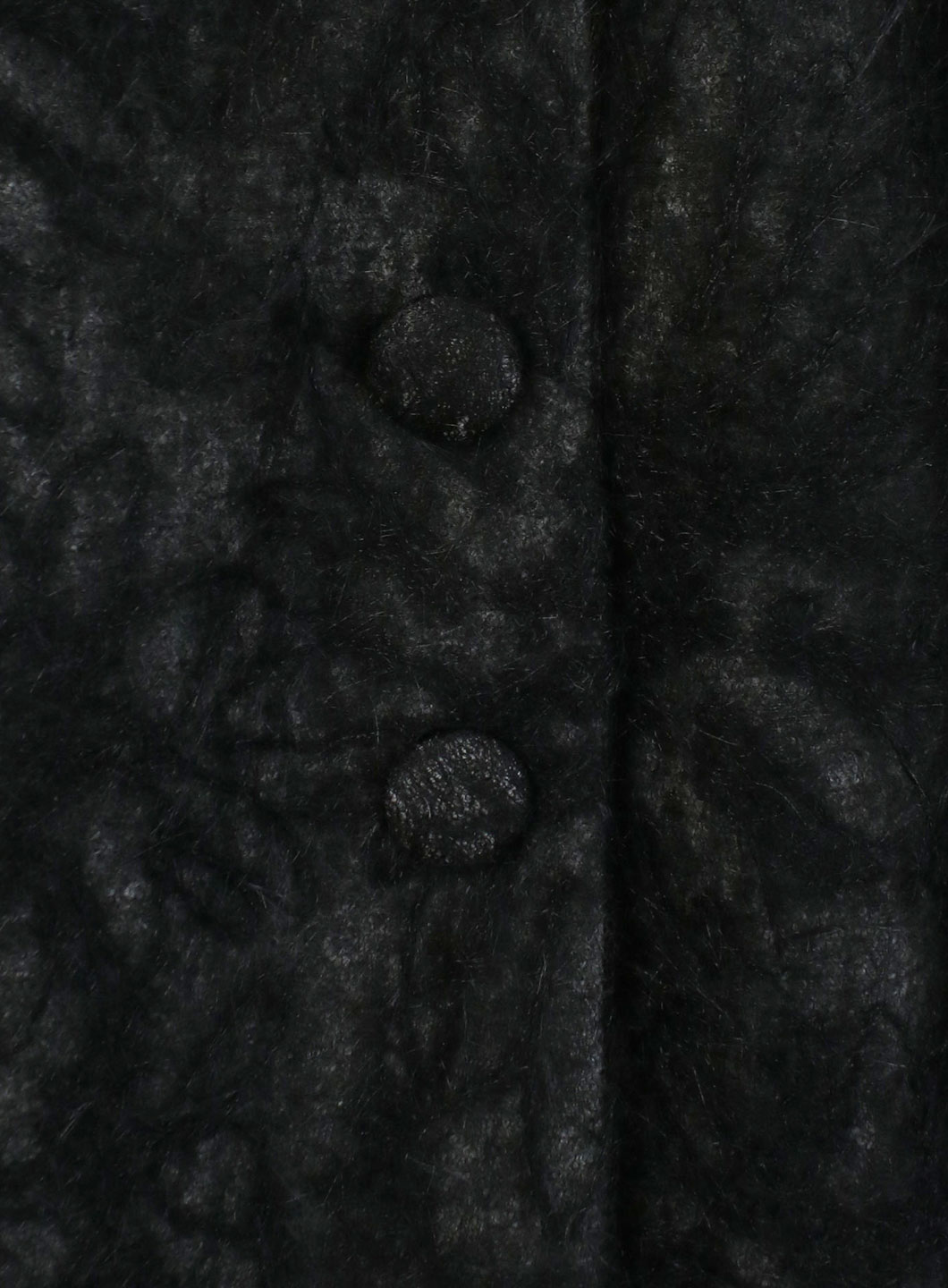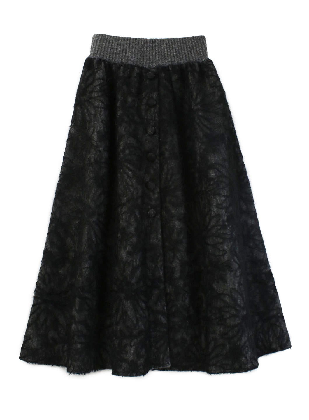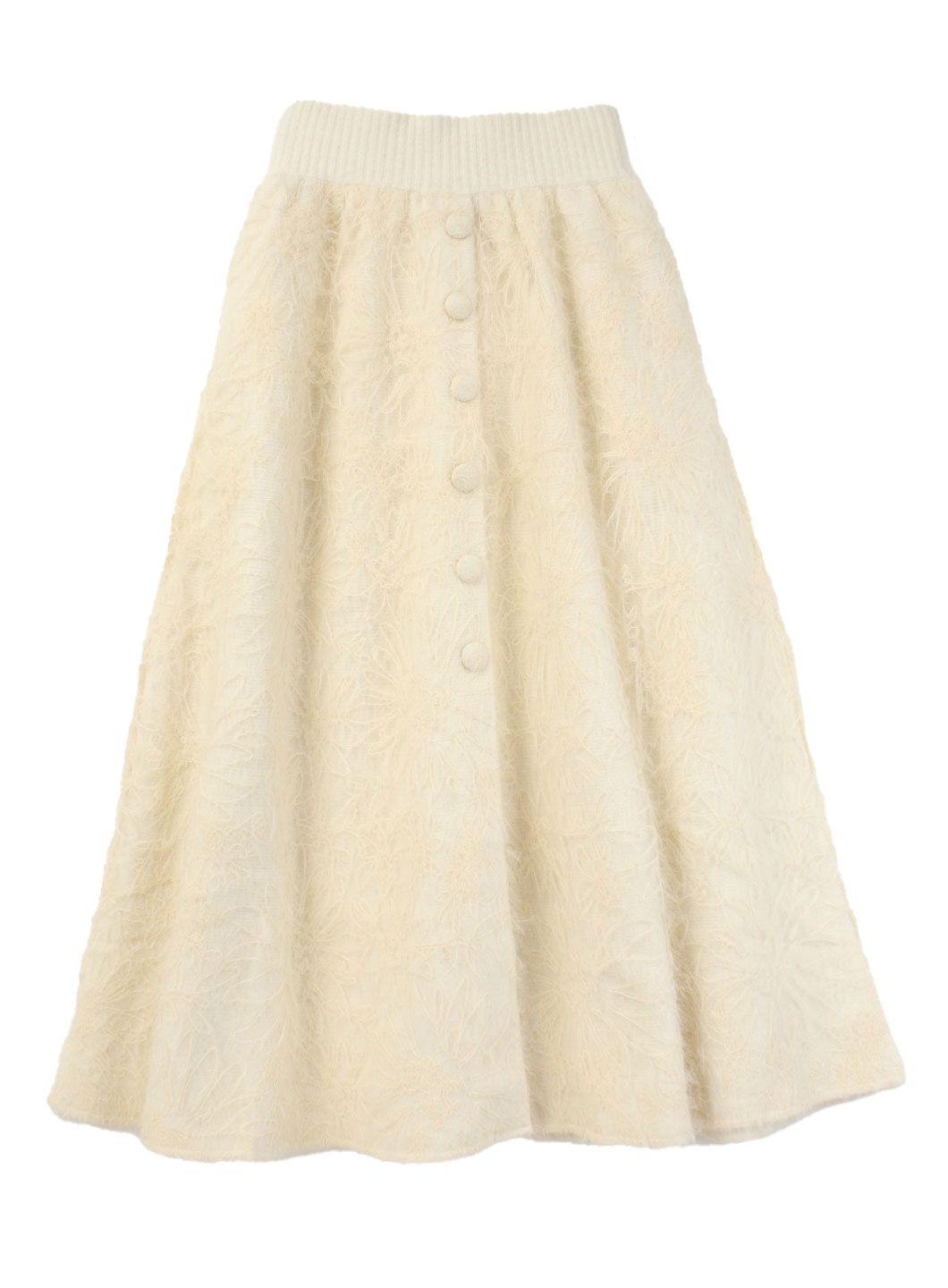 起毛のようなシャギーの糸が絡んでいるレースと、総針の編み地の糸を剥いだ生地にして作成したボリュームたっぷりのレーススカート。