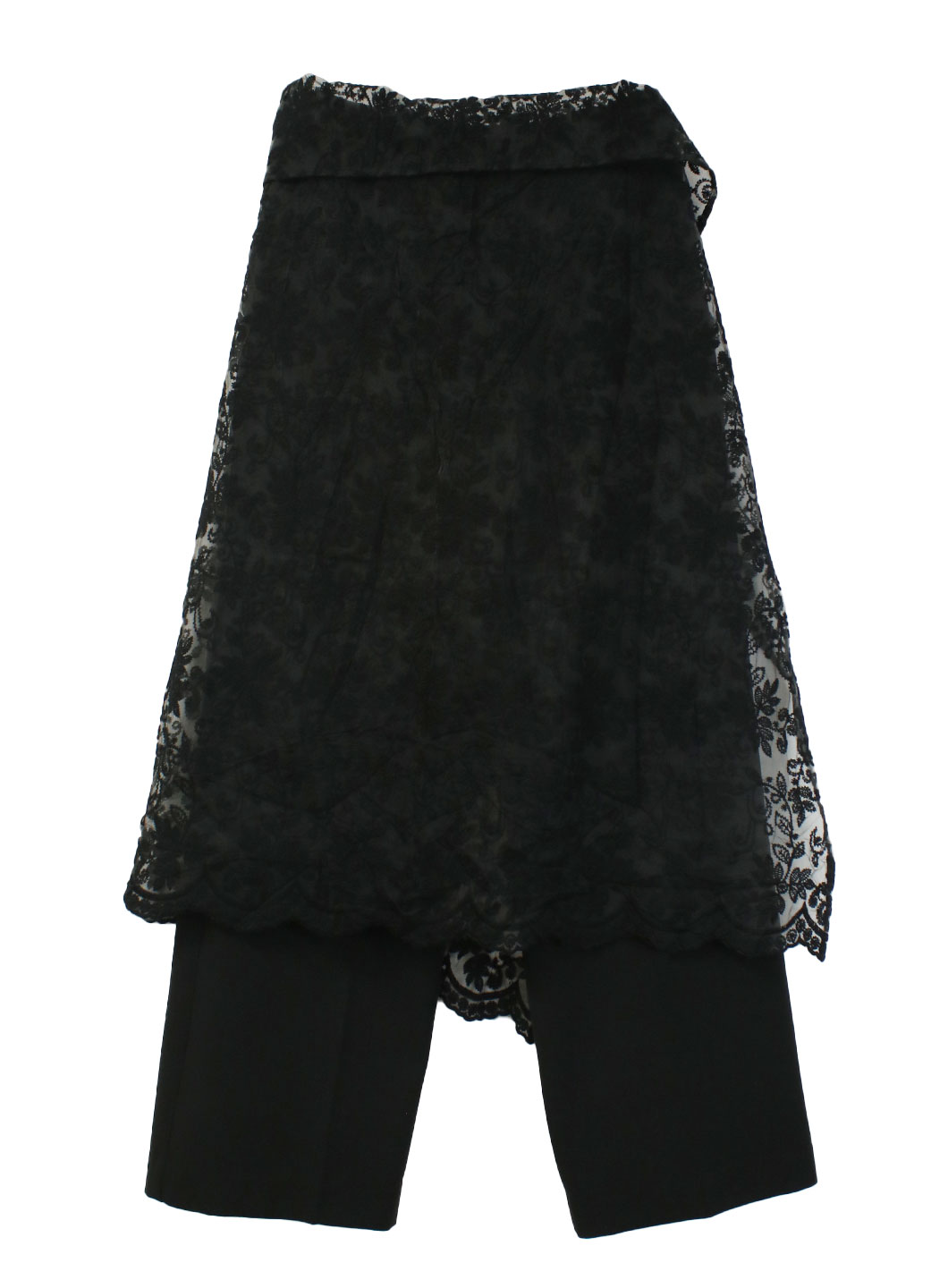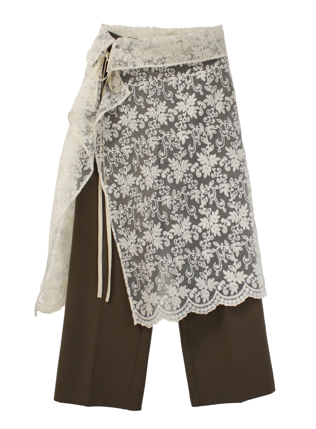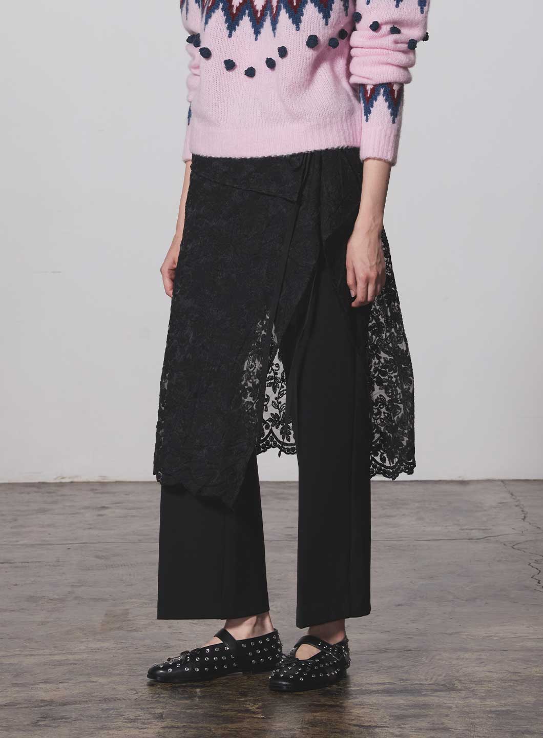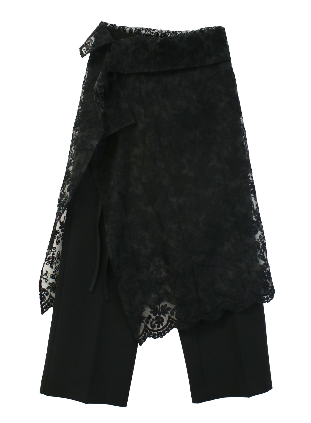 1枚で履いても美しいラインのスラックスパンツに、トレンドのレーススカートを組み合わせたセットアイテム。