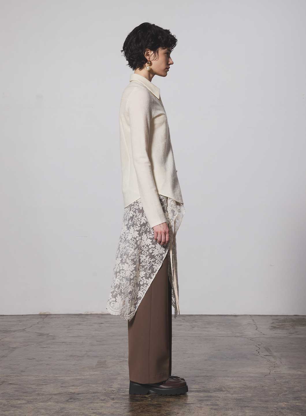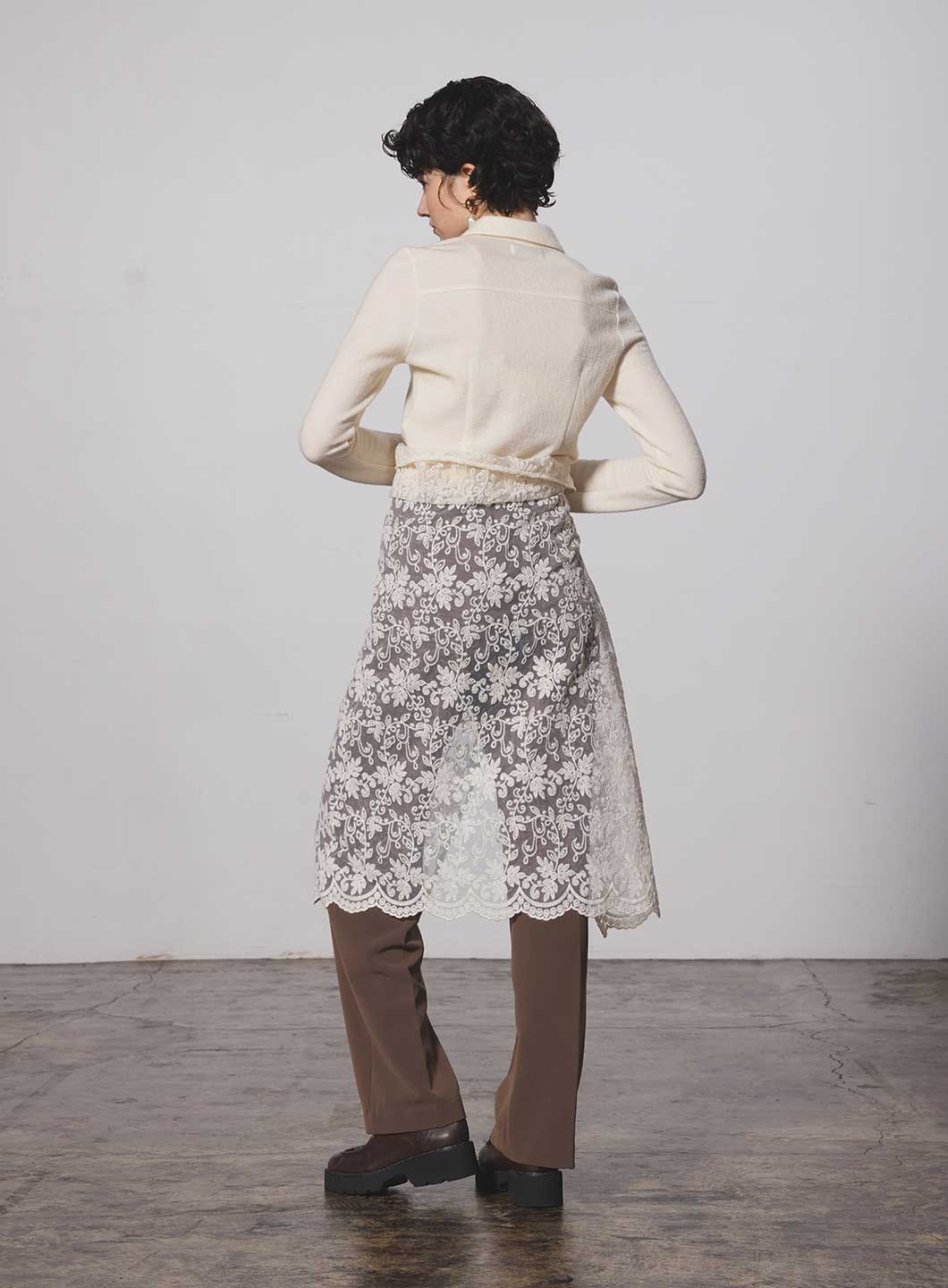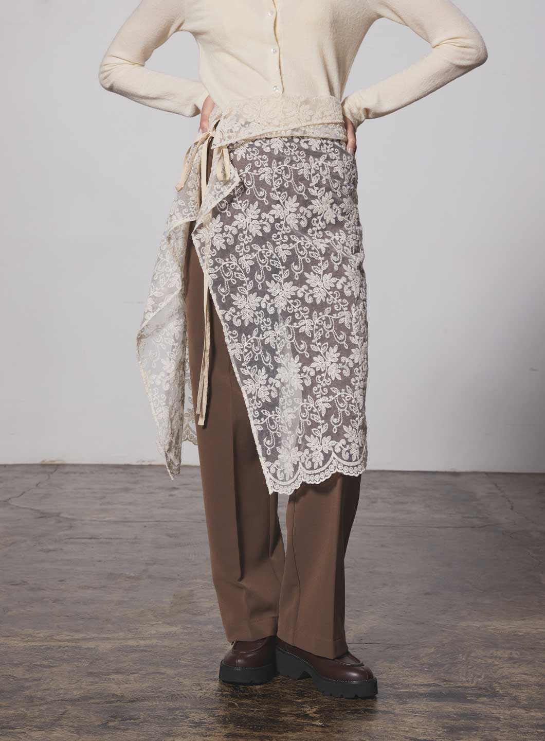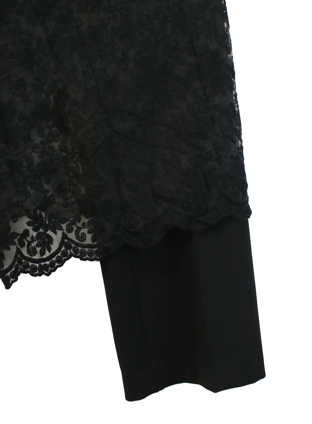 1枚で履いても美しいラインのスラックスパンツに、トレンドのレーススカートを組み合わせたセットアイテム。