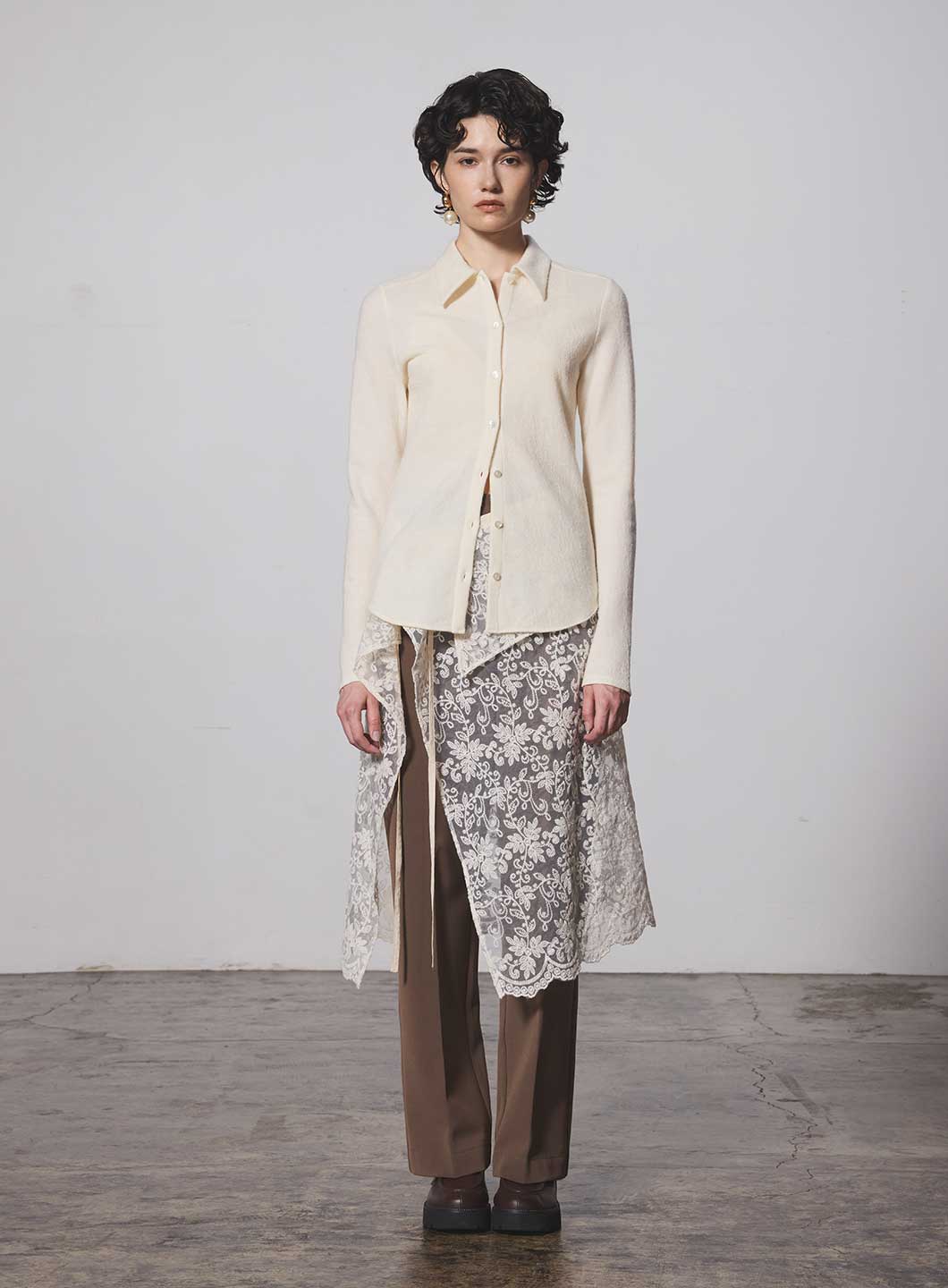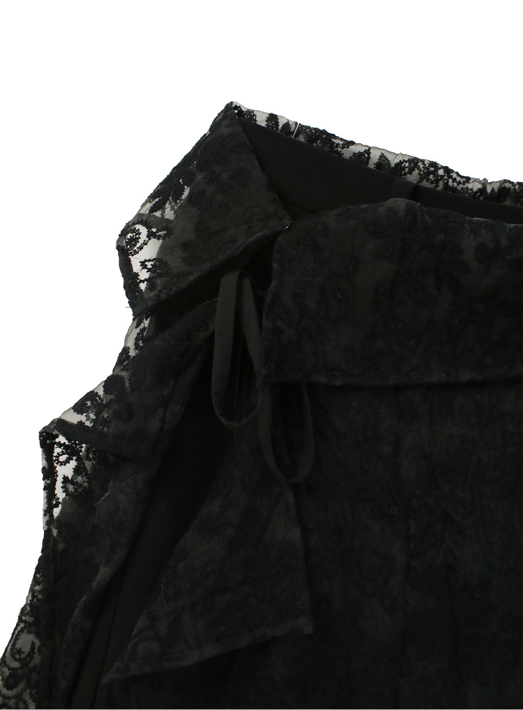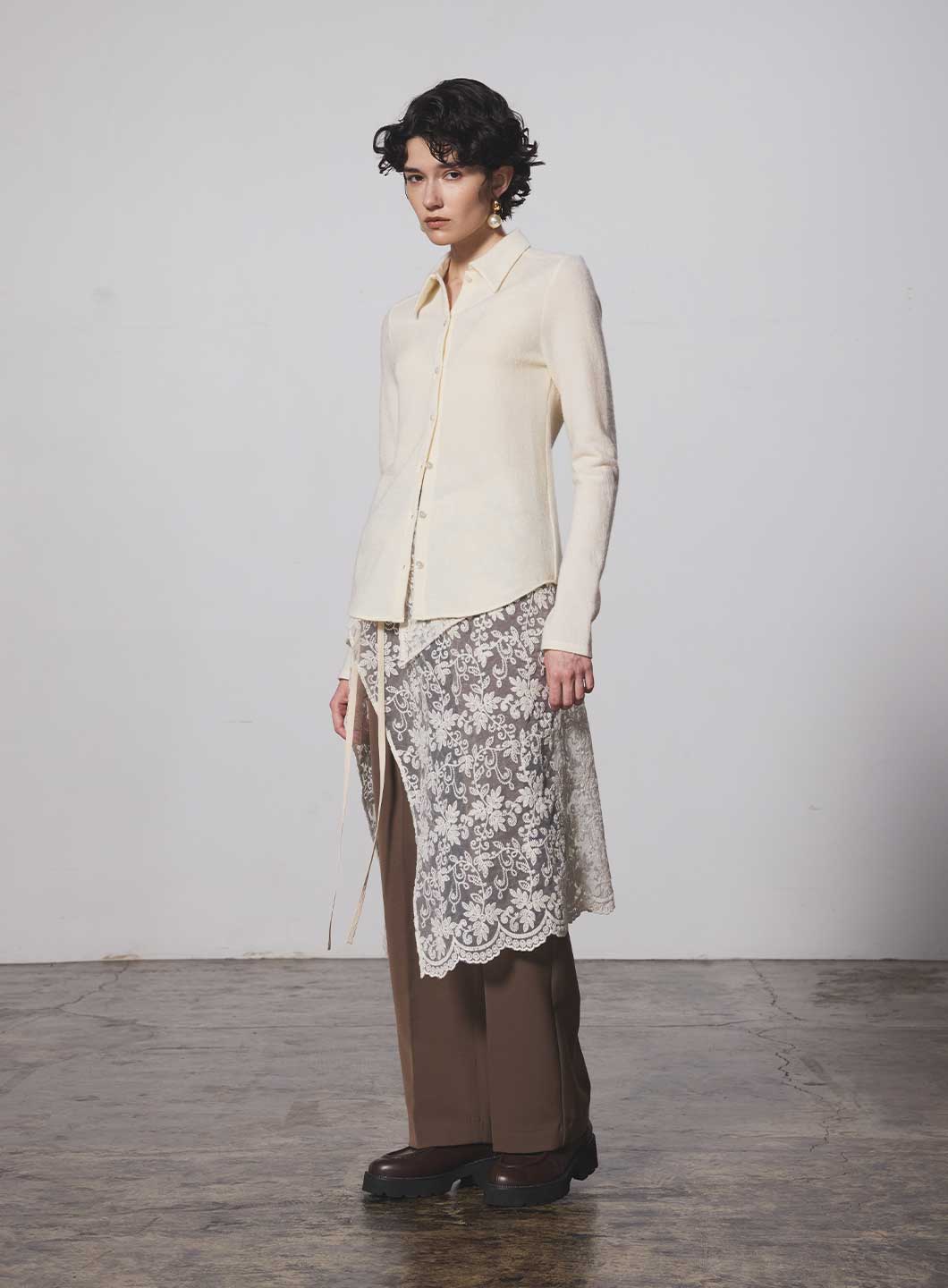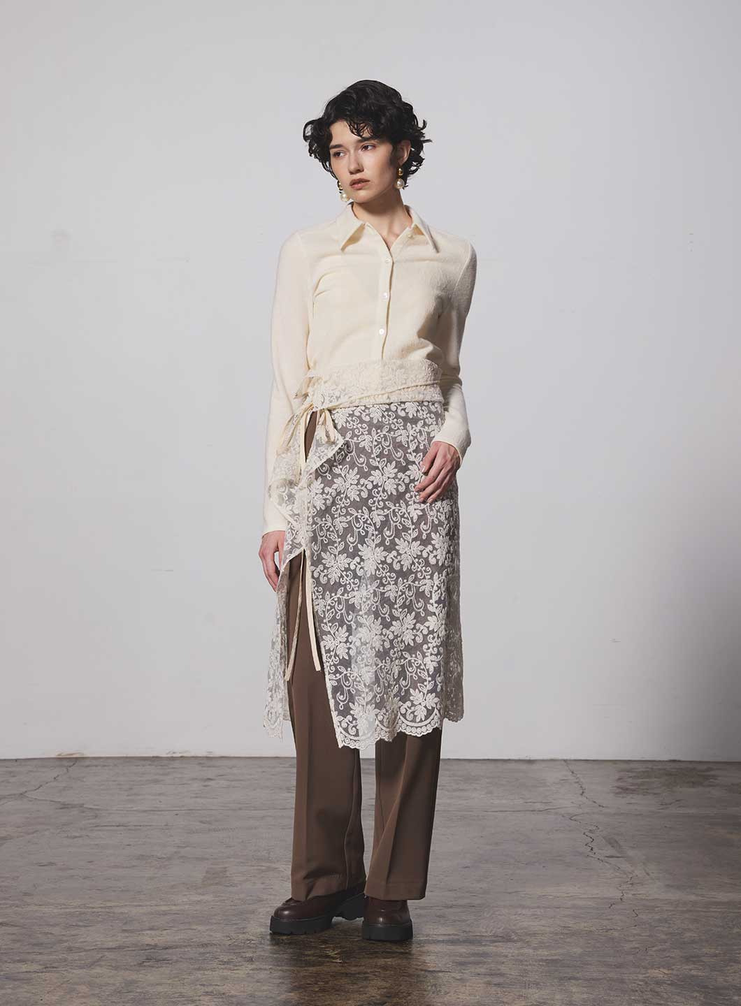 1枚で履いても美しいラインのスラックスパンツに、トレンドのレーススカートを組み合わせたセットアイテム。
